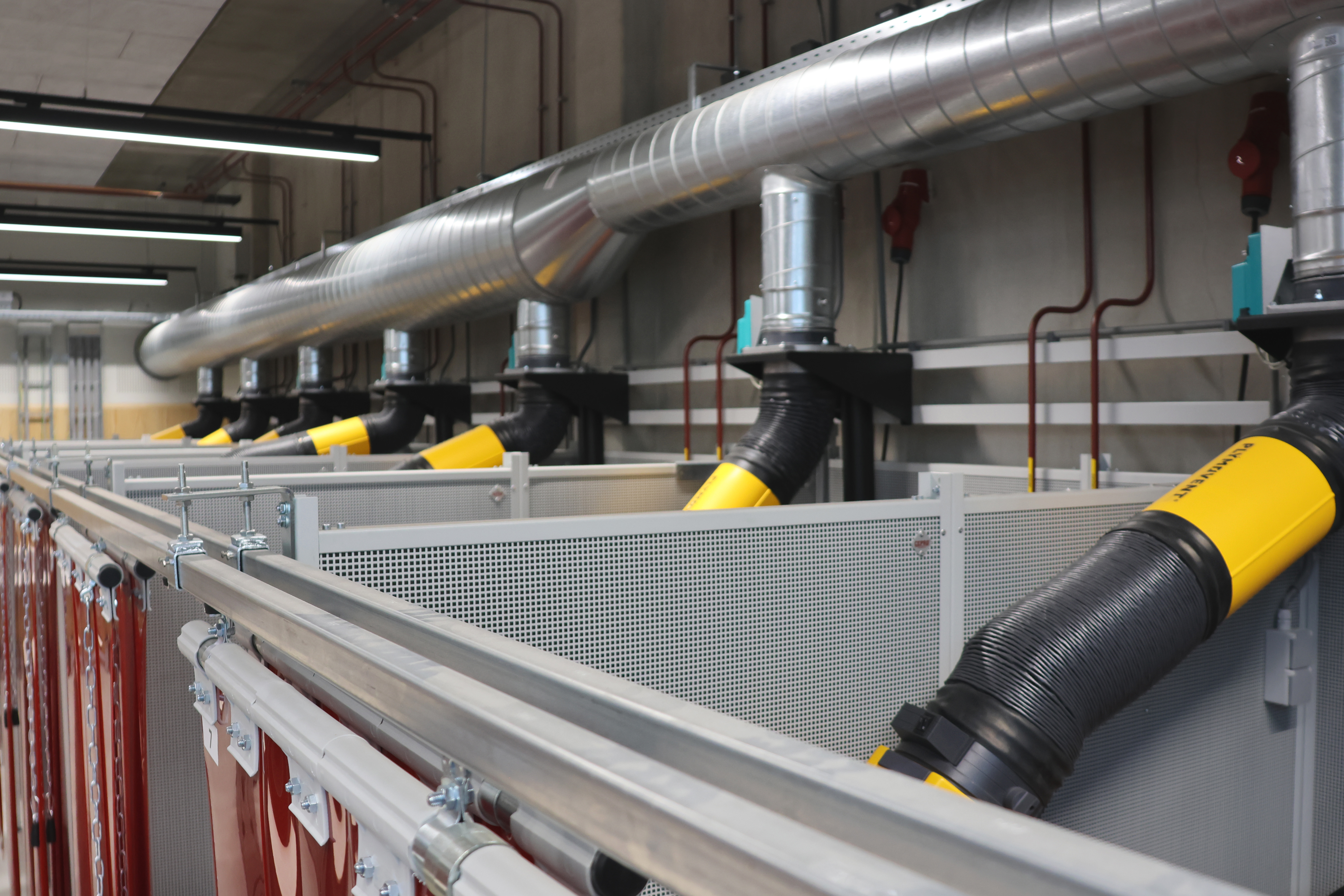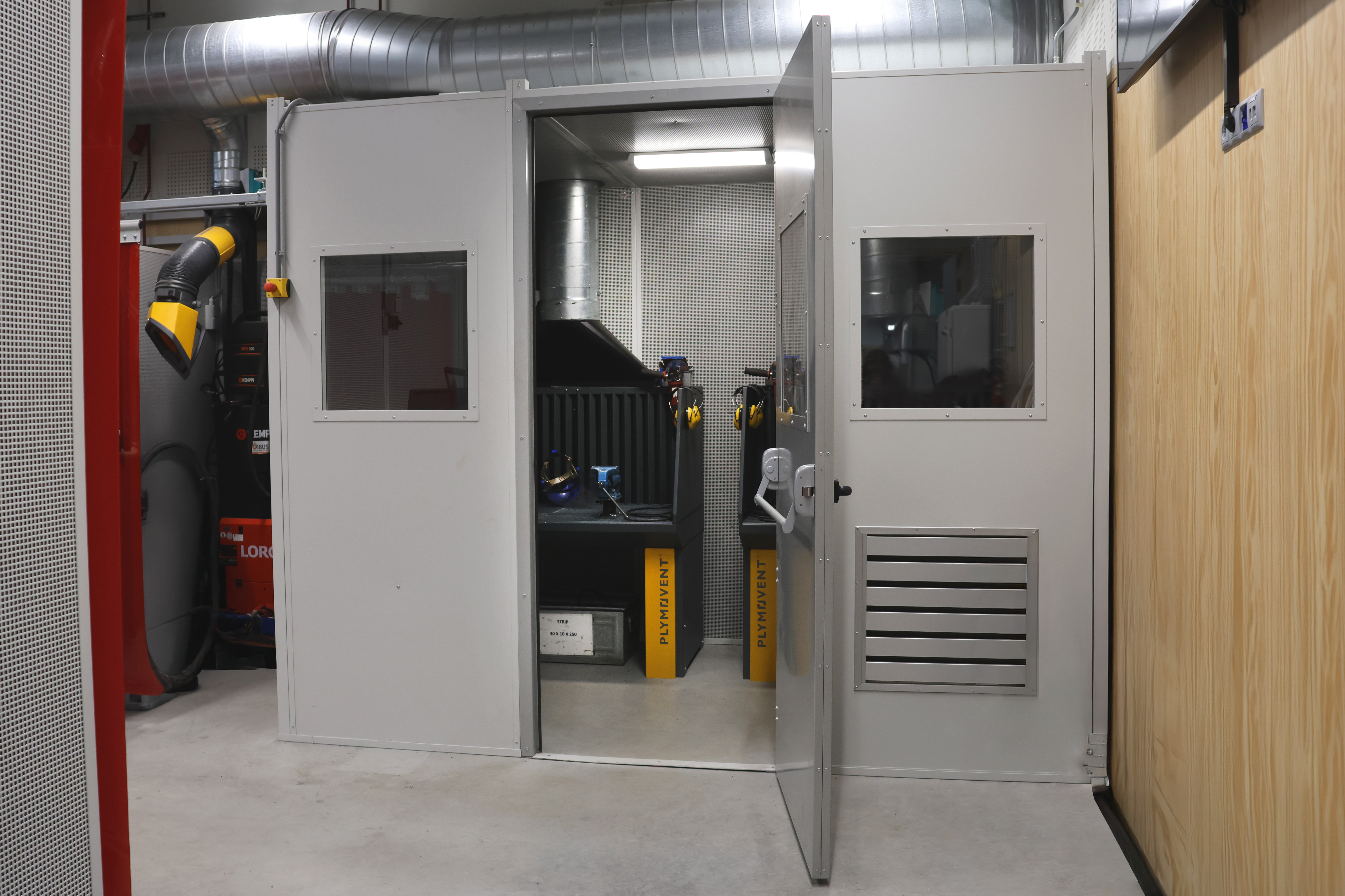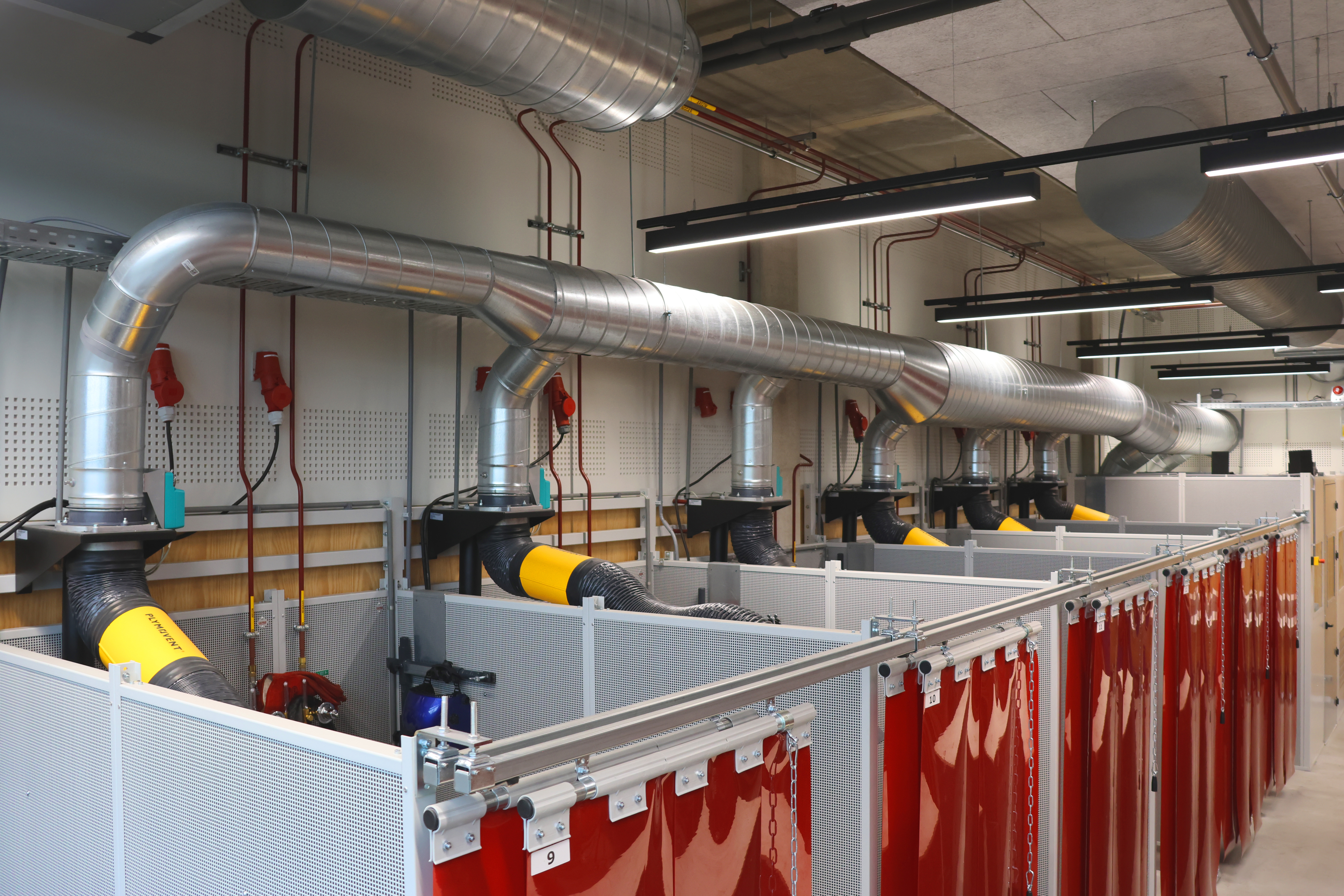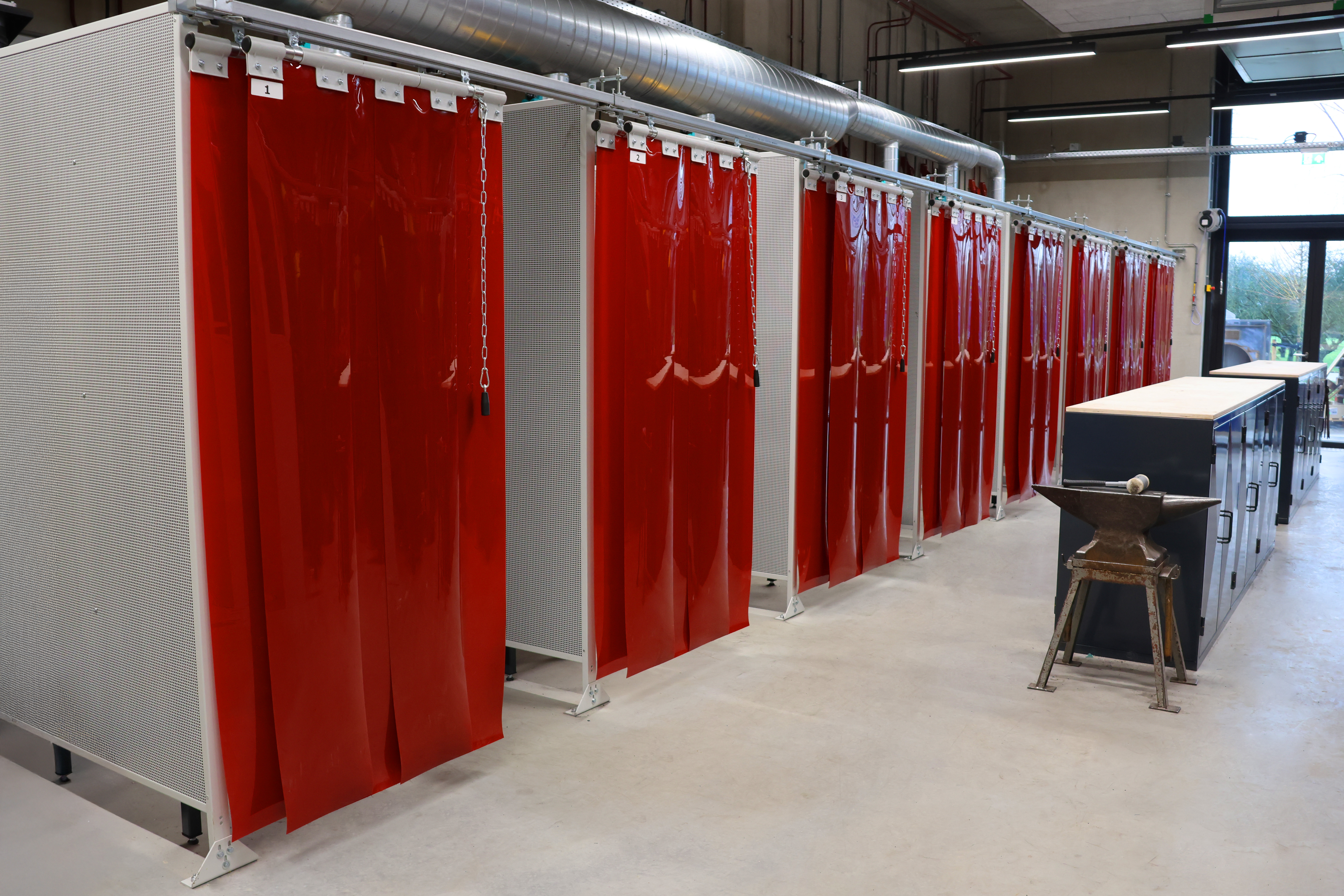 Für die Schweißzonen wurden Cepro-Schweißkabinen gewählt, die für ihre schalldämpfenden Eigenschaften und modulare Flexibilität bekannt sind. Diese Kabinen ermöglichen es, verschiedene Schweißmethoden anzuwenden, während Studierende und Lehrkräfte vor Lärm und Strahlung geschützt bleiben. Auch in Bezug auf das Design fügen sich die Kabinen harmonisch in die moderne Einrichtung des Gebäudes ein.