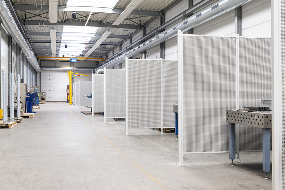 Eine bestehende Produktionsstätte wollte mit neuen Arbeitsbereichen erweitert werden, in denen Schweißer arbeiten können, ohne durch Lärm gestört zu werden und ohne ästhetische Abweichungen von der Fabrikatmosphäre.
