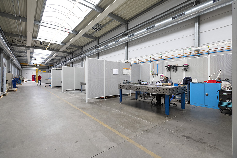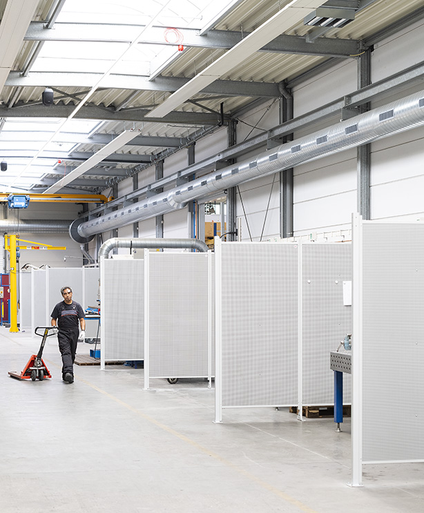 Bei der Van Hoof Gruppe in Asten stand eine Erweiterung der bestehenden Produktionsstätte auf dem Plan. Das Unternehmen hatte das Ziel, neue Arbeitsbereiche zu schaffen, in denen Schweißer sicher und komfortabel arbeiten konnten, ohne die Ausstrahlung und Einrichtung der Fabrik zu beeinträchtigen. Die Herausforderung bestand darin, Sicherheit, Funktionalität und Ästhetik zu kombinieren – eine Herausforderung, auf die Cepro perfekt reagierte.