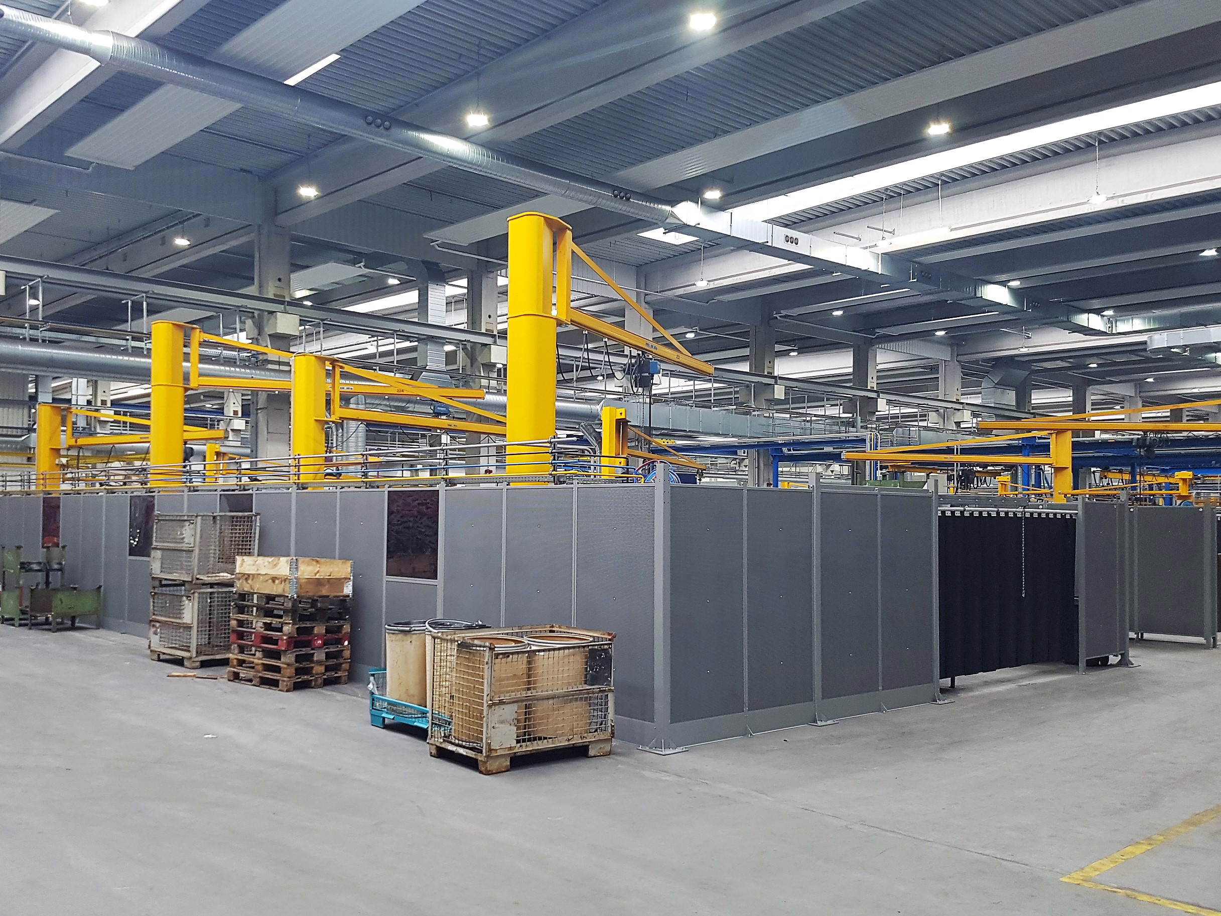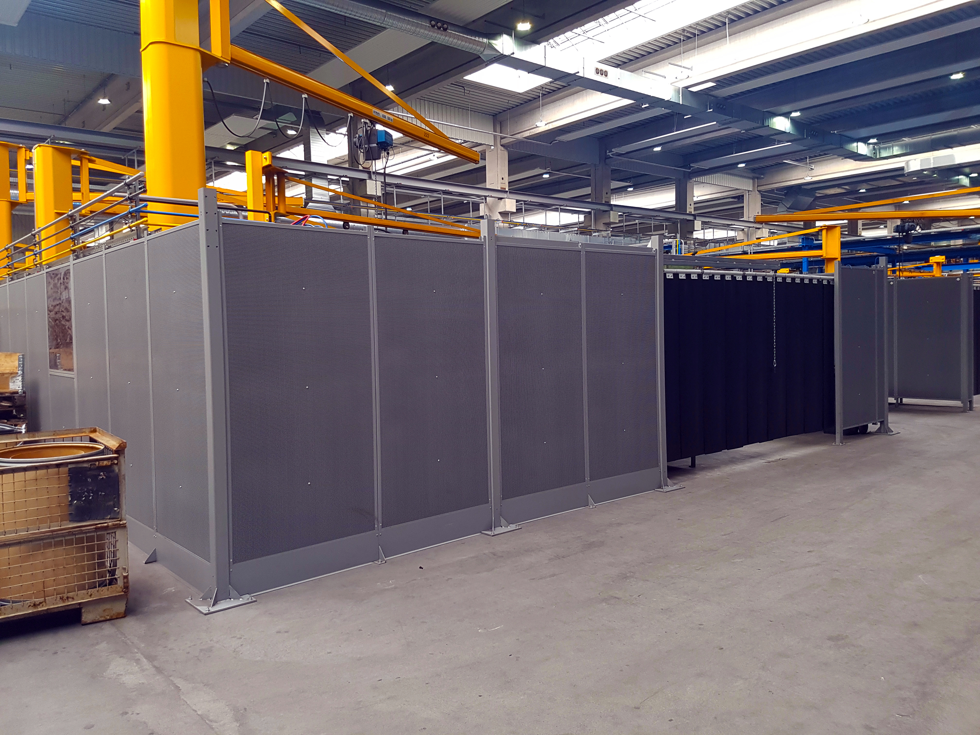 Cepro entwarf eine Anordnung mehrerer abgegrenzter Schweißarbeitsplätze, visuell abgeschirmt mit Schweißlamellen und ausgestattet mit schallabsorbierenden Wänden. Diese Kombination sorgt für eine sichere Arbeitsumgebung mit minimaler Lärmbelästigung und einer professionellen, organisierten Optik.
